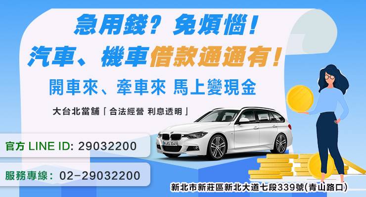 大台北熱門借款諮詢:新莊汽車借款、新莊機車借款、泰山汽車借款、樹林汽車借款、林口汽車借款、龜山汽車借款、迴龍汽車借款、五股汽車借款……等等地區,當鋪利息優惠實施中,歡迎辦理...。